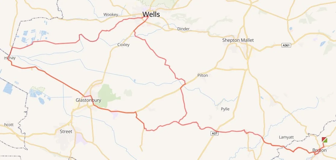 After refuelling, time to keep travelling through the Levels to Wells, before heading for North Wootton and Stickleball hill – hopefully you will have digested your cake by this point. Once at the top, it’s along familiar roads to home.